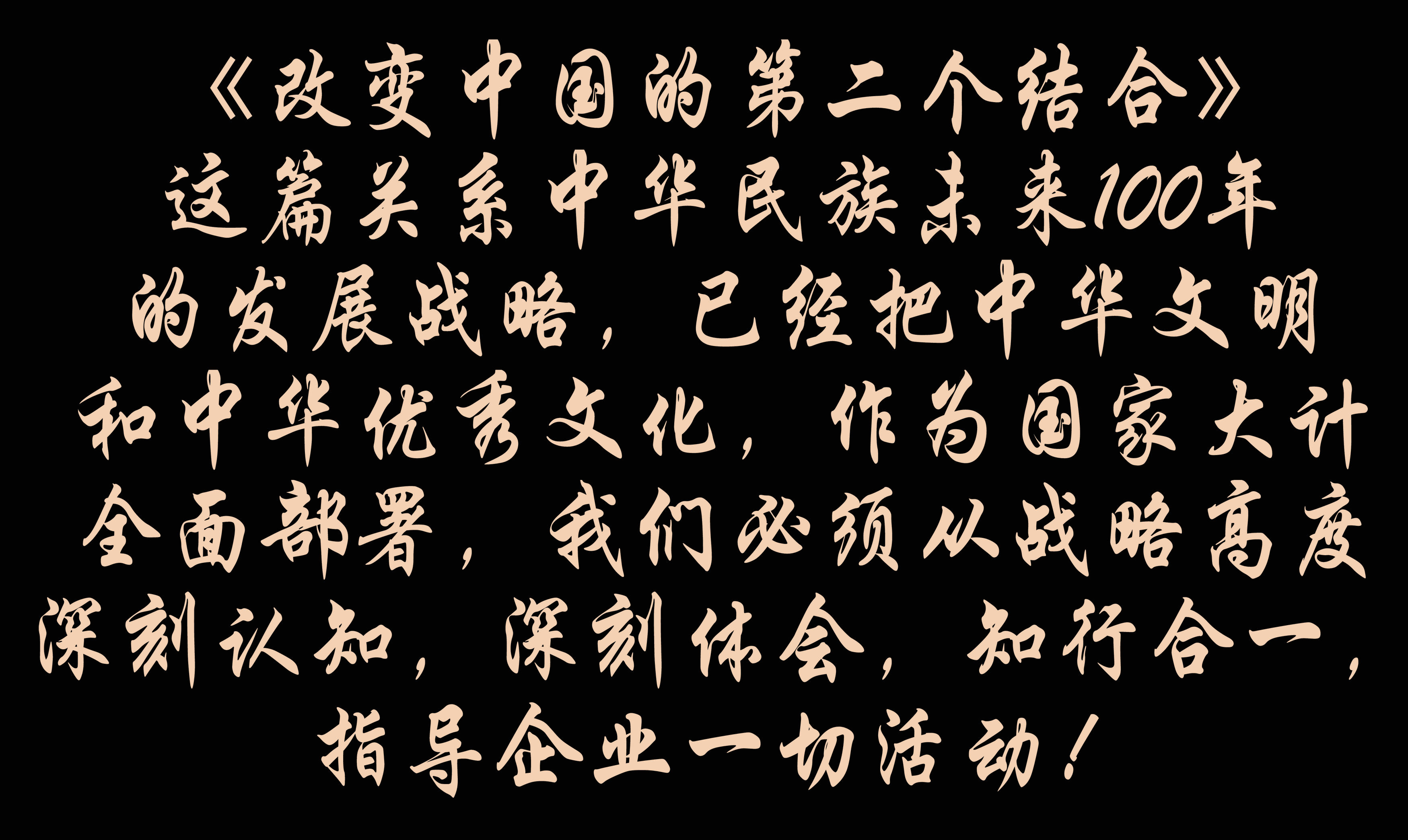 《改變中國的第二個結合》這篇關系中華民族未來100年的發(fā)展戰(zhàn)略,已經(jīng)把中華文明和中華優(yōu)秀文化,作為國家大計全面部署,我們必須從戰(zhàn)略高度深刻認知,深刻體會,知行合一,指導企業(yè)一切活動!
