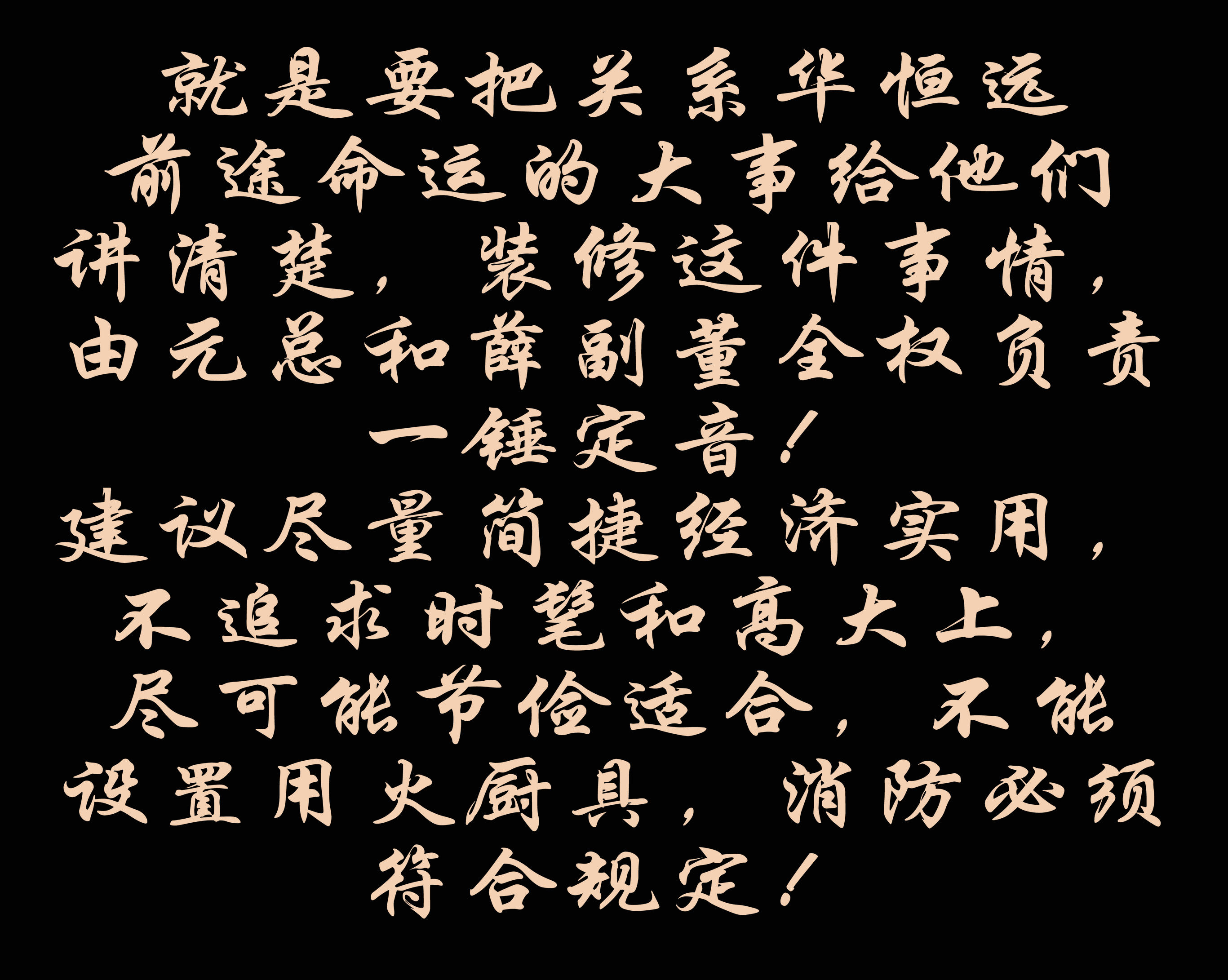 我下午約見董事長夫婦一晤,就是要把關系華恒遠前途命運的大事給他們講清楚,裝修這件事情,由元總和薛副董全權負責一錘定音!