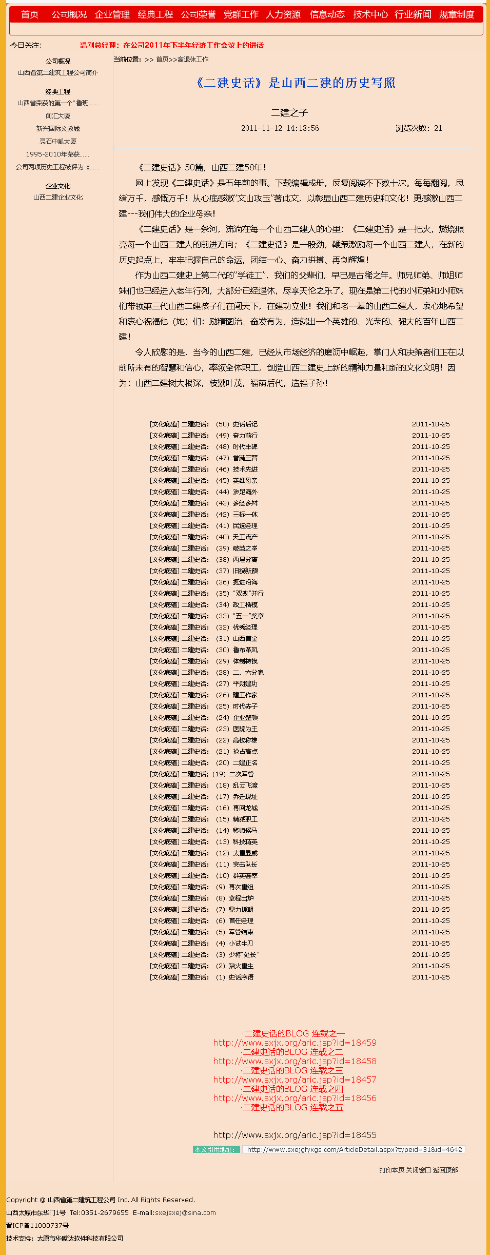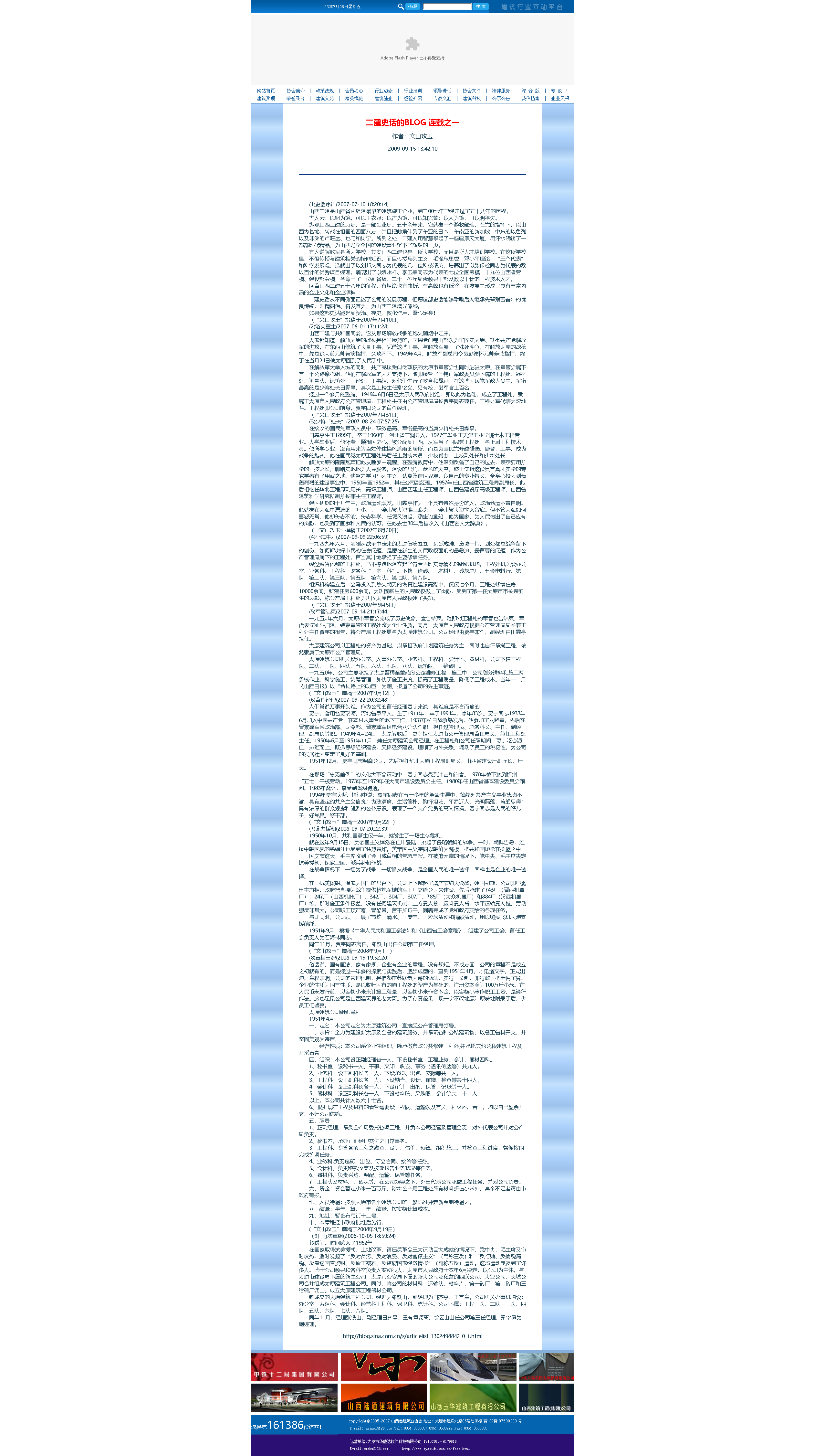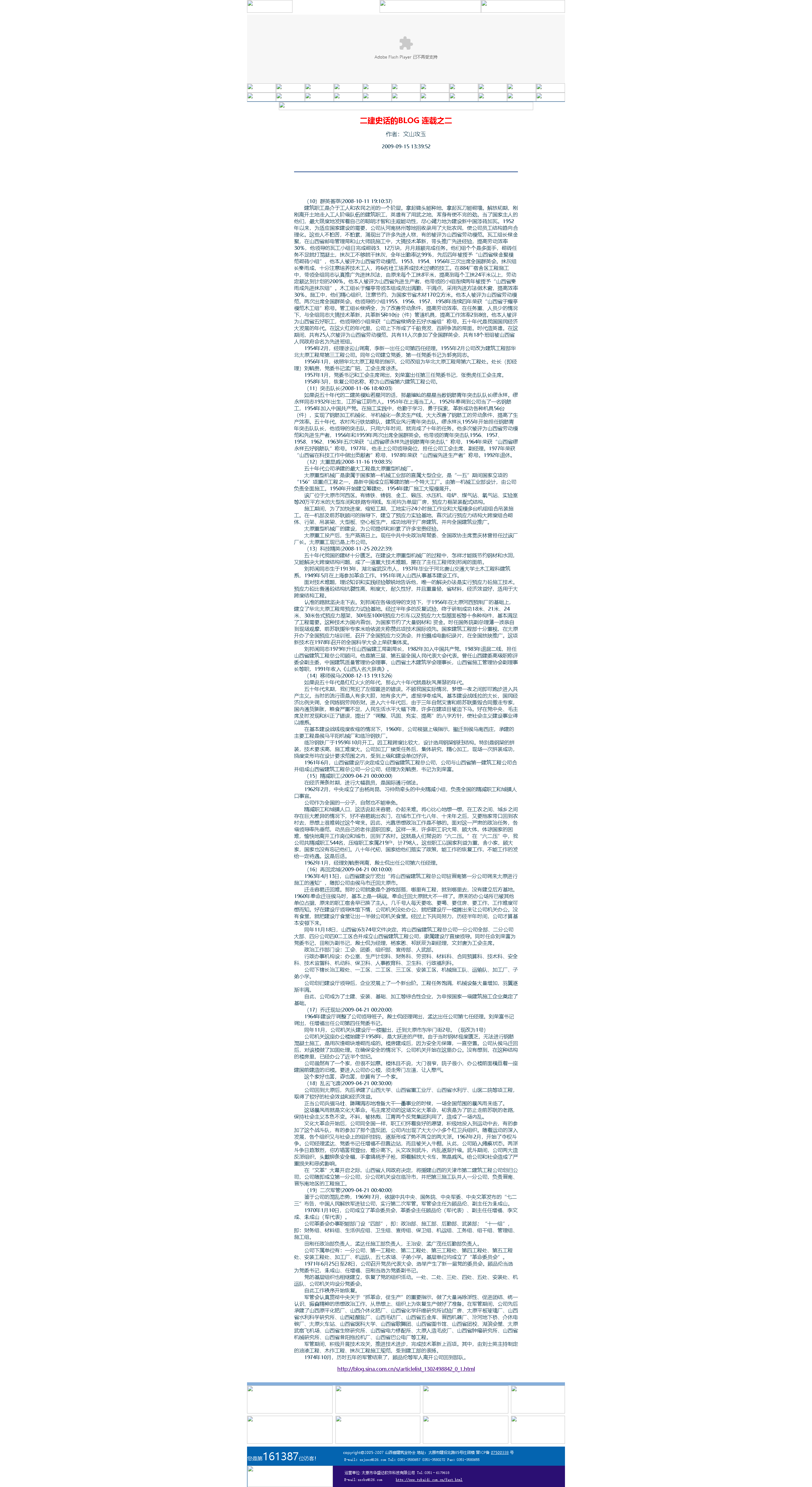 這是2009年9月15日首次在山西省建筑業(yè)協(xié)會網(wǎng)站全文轉(zhuǎn)發(fā)張文玉同志所撰《二建史話》五十篇。