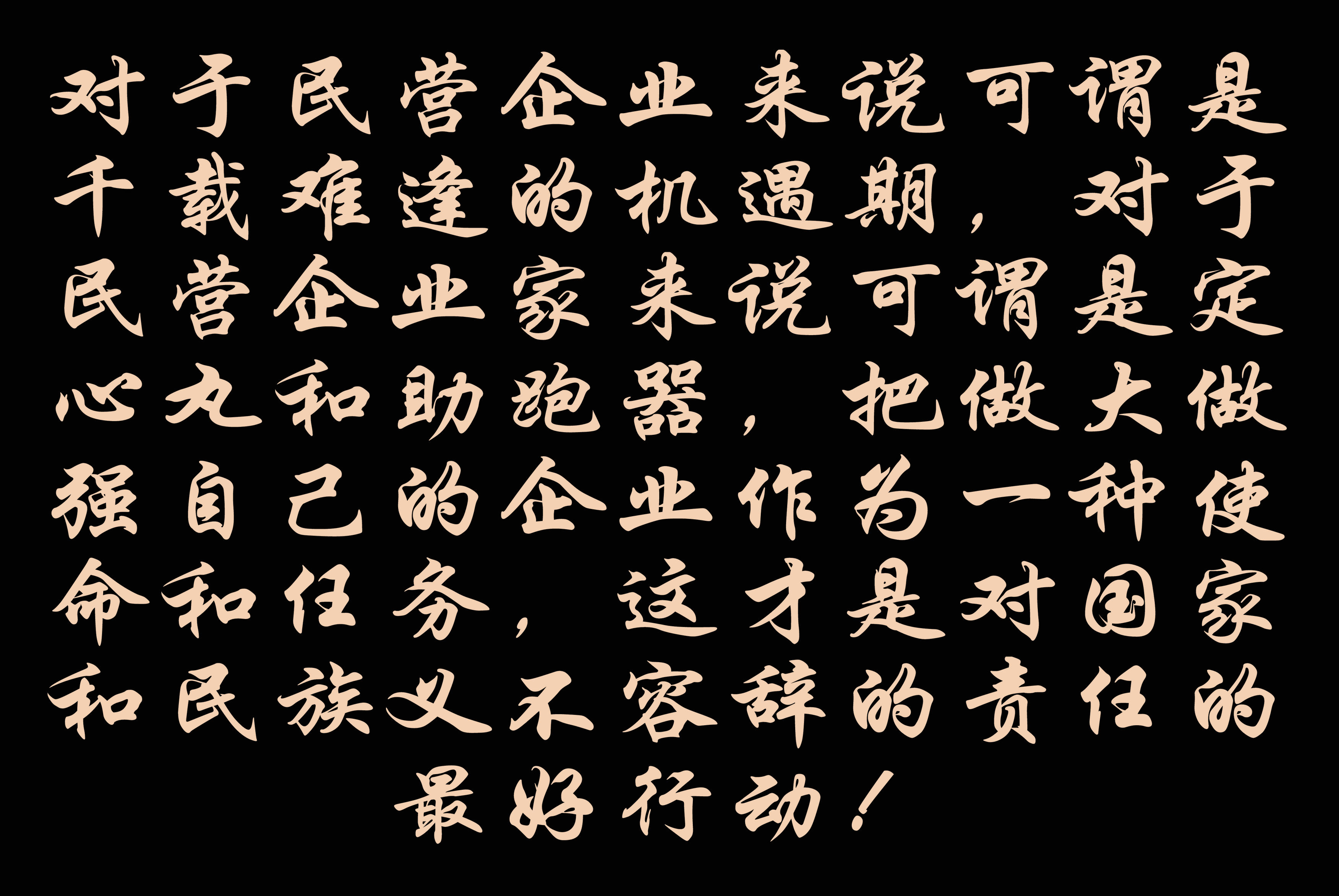 國(guó)家發(fā)改委等8部門剛剛發(fā)布的《關(guān)于實(shí)施促進(jìn)民營(yíng)經(jīng)濟(jì)發(fā)展近期若干舉措的通知》28條利好政策,可謂是全方位360度為民營(yíng)經(jīng)濟(jì)發(fā)展壯大提供全方位支持的力度,對(duì)于民營(yíng)企業(yè)來說可謂是千載難逢的機(jī)遇期,對(duì)于民營(yíng)企業(yè)家來說可謂是定心丸和助跑器,把做大做強(qiáng)自己的企業(yè)作為一種使命和任務(wù),這才是對(duì)國(guó)家和民族義不容辭的責(zé)任的最好行動(dòng)!