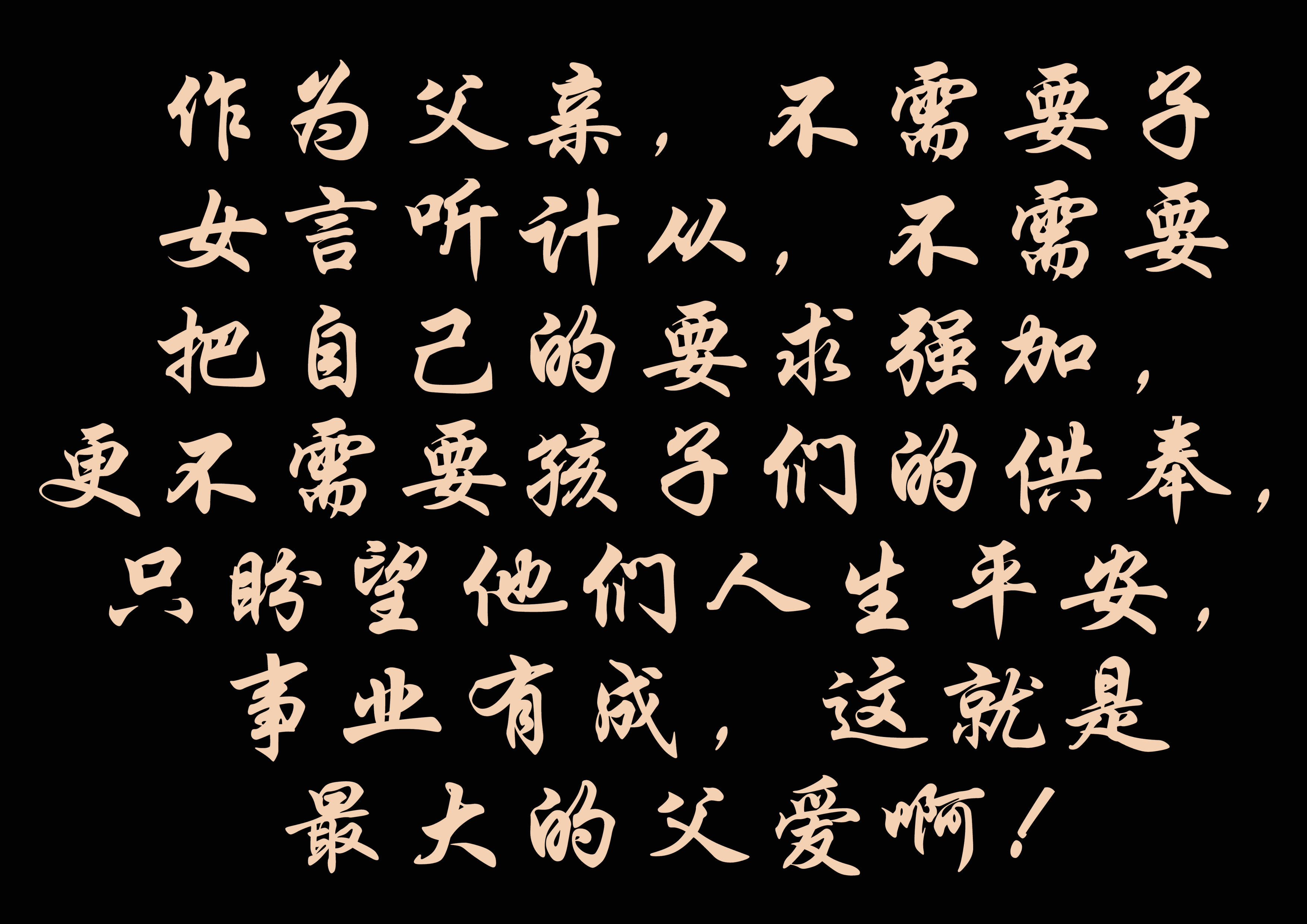 父子之間,需要互相關(guān)心,需要互相理解,更需要實(shí)實(shí)在在的付出!作為父親,不需要子女言聽計(jì)從,不需要把自己的要求強(qiáng)加,更不需要孩子們的供奉,只盼望他們?nèi)松桨玻聵I(yè)有成,這就是最大的父愛??!