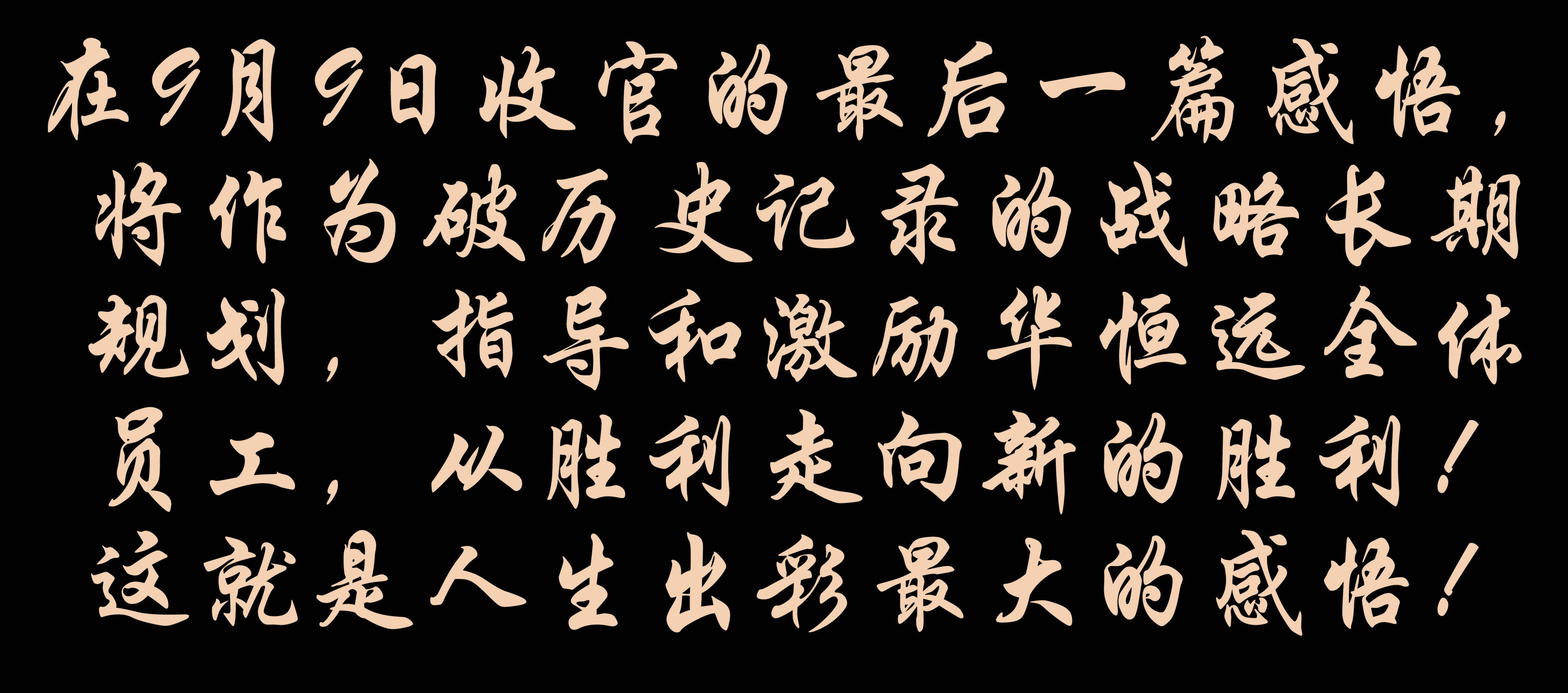 再有10篇就圓滿完成500篇了,在9月9日收官的最后一篇感悟,將作為破歷史記錄的戰(zhàn)略長期規(guī)劃,指導(dǎo)和激勵華恒遠全體員工,從勝利走向新的勝利!