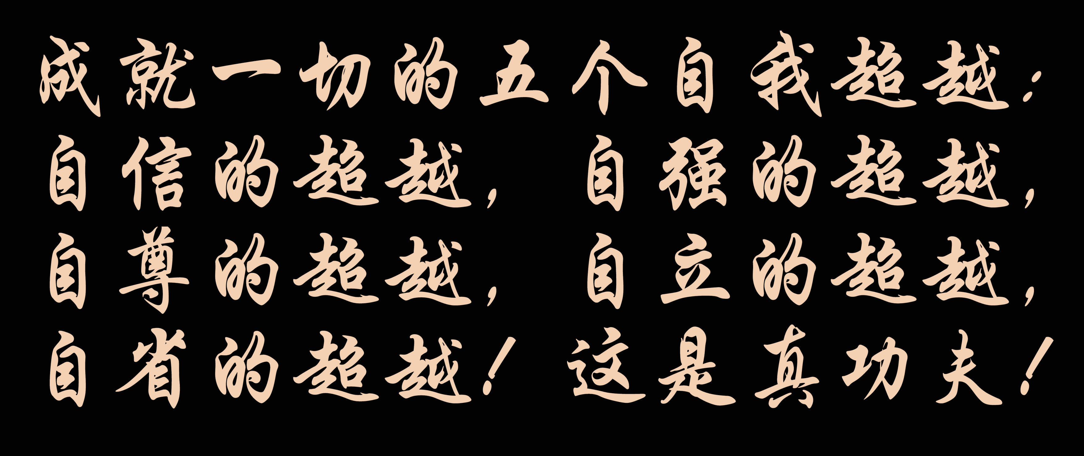 真功夫,硬功夫,在修煉,在修心,在“五不怕”,在“五不粘”!真正做到這些,就有了成就一切的五個自我超越:自信的超越,自強(qiáng)的超越,自尊的超越,自立的超越,自省的超越!這是真功夫!