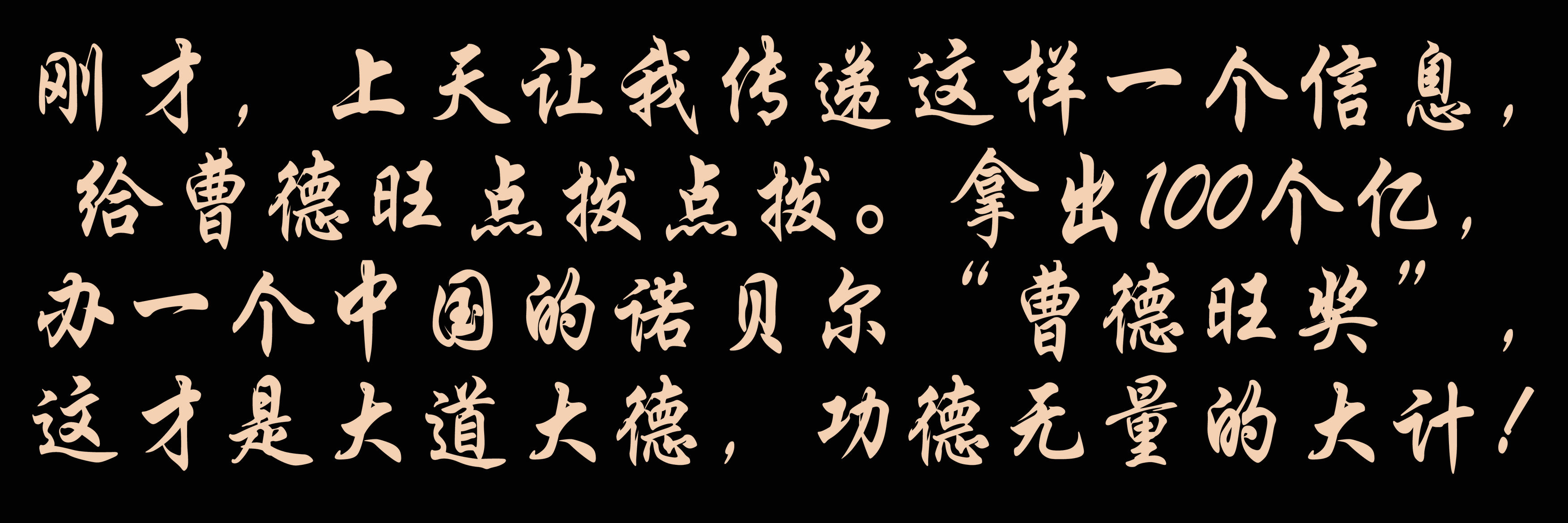 剛才,上天傳遞一個信息,給曹德旺先生點撥點撥。你愿意拿出100個億,辦一個“曹德旺獎”,這才是人間正道是滄桑!