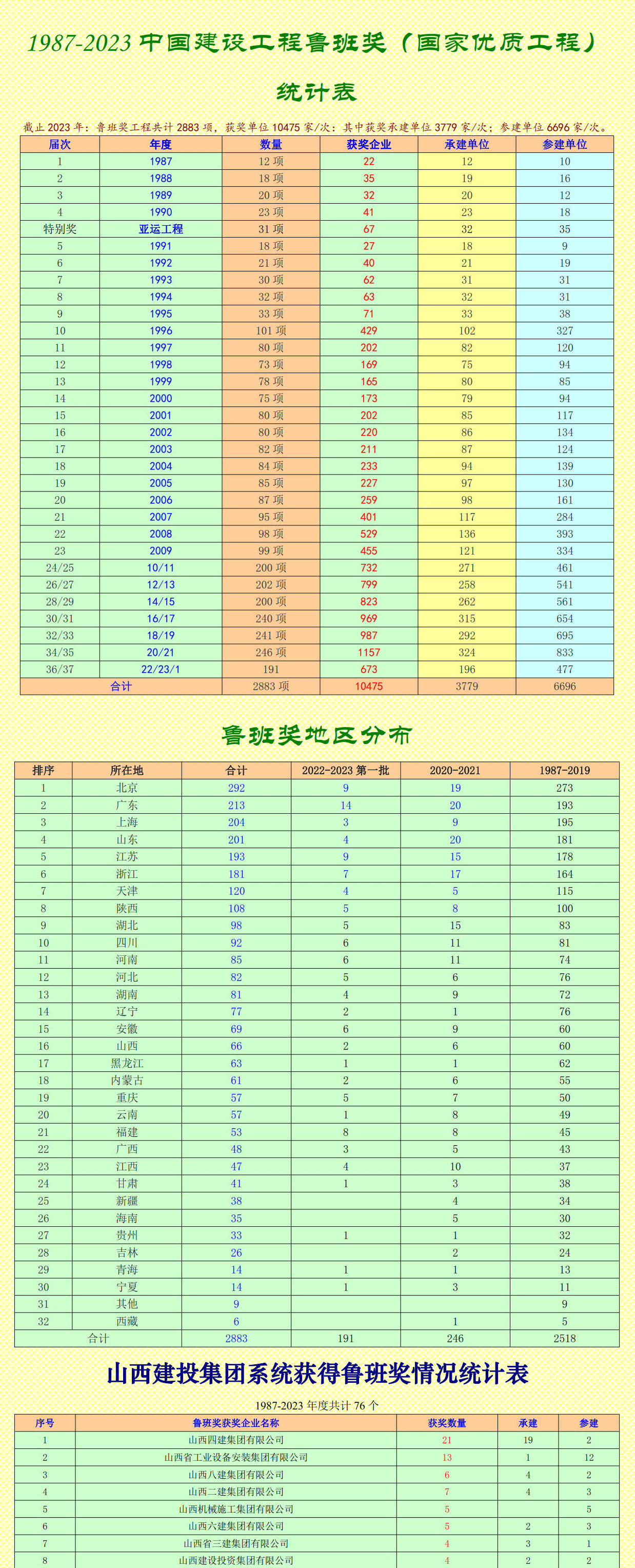 截止2023年:魯班獎(jiǎng)工程共計(jì)2883項(xiàng),獲獎(jiǎng)單位10475家/次:其中獲獎(jiǎng)承建單位3779家/次;參建單位6696家/次。