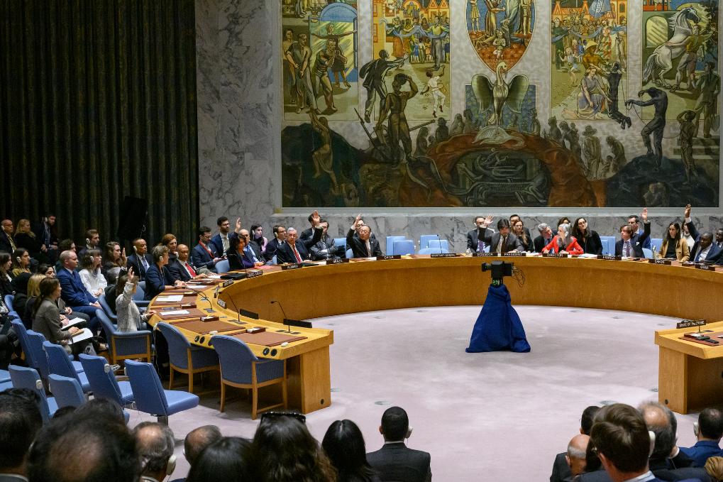 這是12月8日在位于紐約的聯(lián)合國總部拍攝的聯(lián)合國安理會會議現(xiàn)場。美國當(dāng)天否決了聯(lián)合國安理會一份旨在推動實(shí)現(xiàn)巴以人道主義?;鸬臎Q議草案。新華社發(fā)(聯(lián)合國供圖/洛伊·費(fèi)利佩攝)