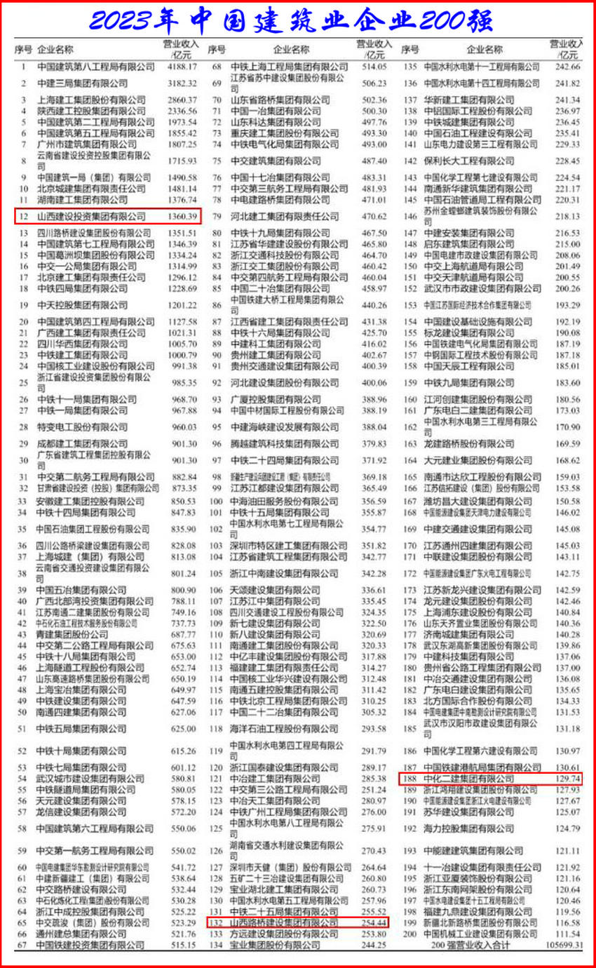 中建八局4188億,營業(yè)收入第一!2023年建筑業(yè)企業(yè)200強(qiáng)榜單!