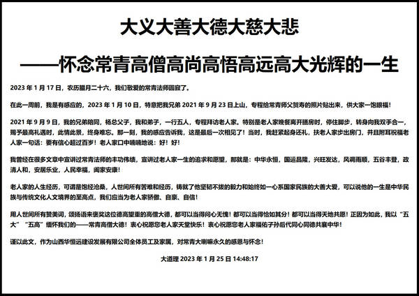 五臺山佛教協(xié)會發(fā)布訃告: