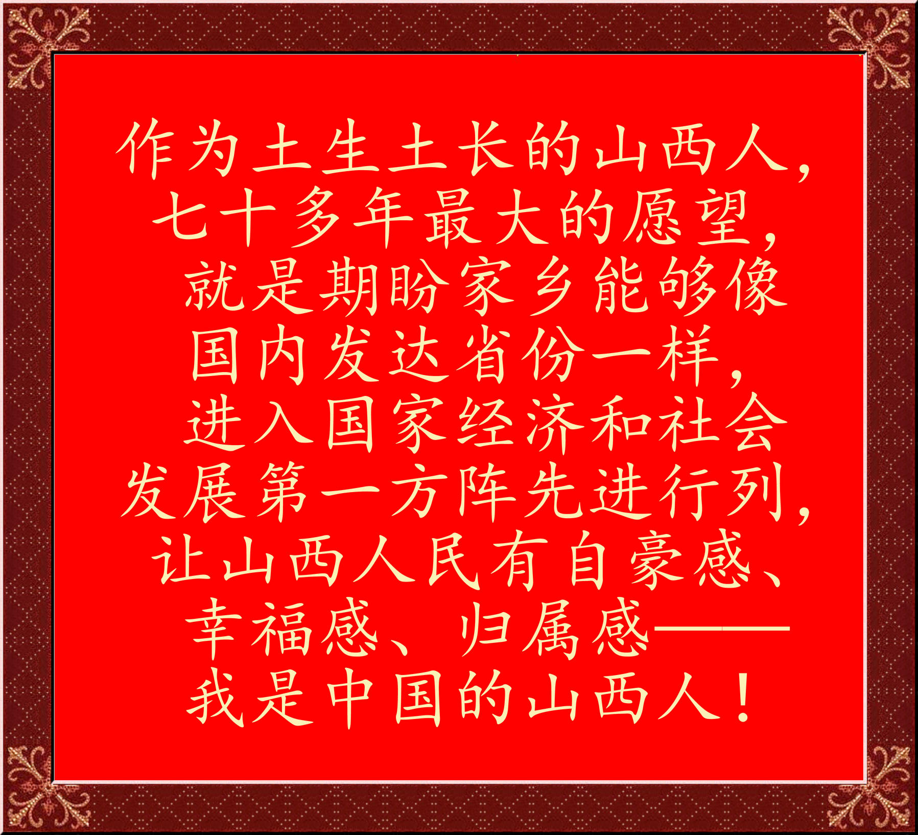 作為土生土長的山西人,七十多年最大的愿望,就是期盼家鄉(xiāng)能夠像國內(nèi)發(fā)達省份一樣,進入國家經(jīng)濟和社會發(fā)展第一方陣先進行列,讓山西人民有自豪感、幸福感、歸屬感——我是中國的山西人!