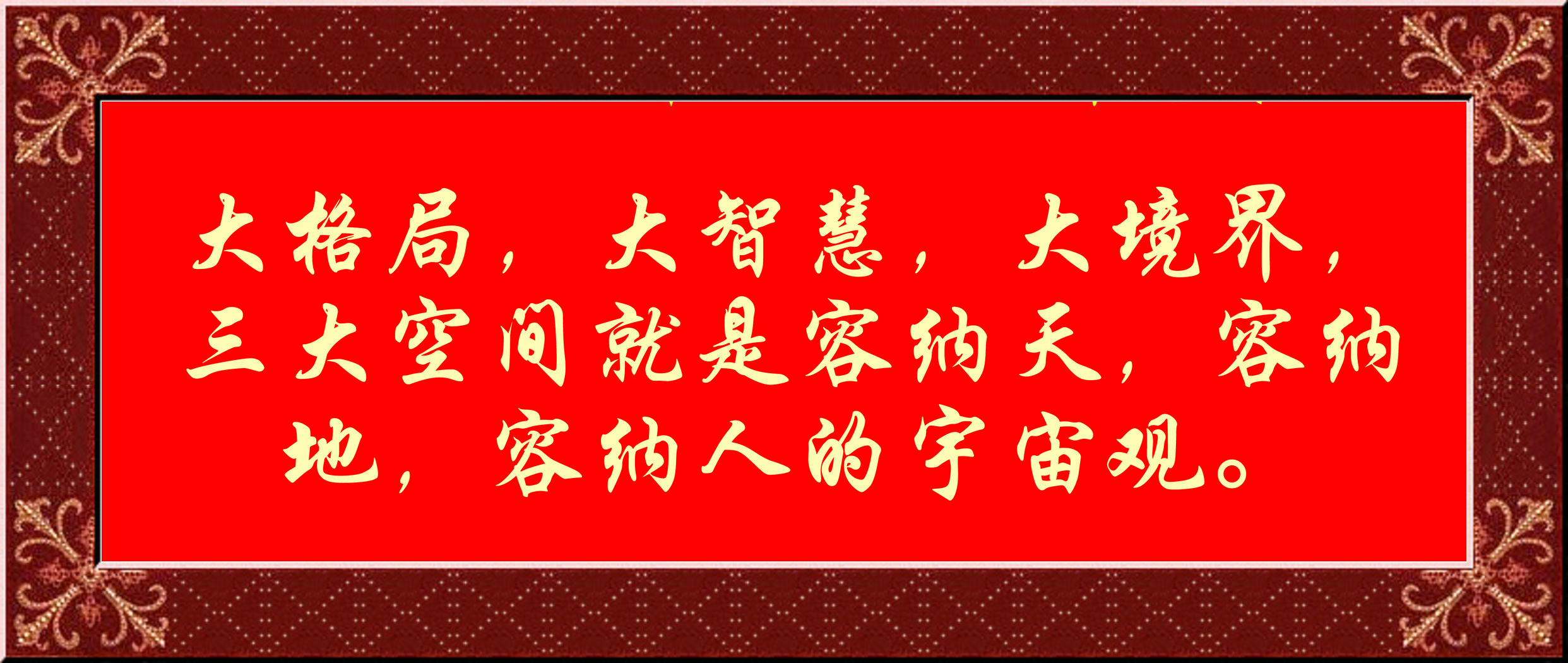 大格局,大智慧,大境界,三大空間就是容納天,容納地,容納人的宇宙觀。人類社會(huì)發(fā)展,從愚魅到理性,上萬(wàn)年發(fā)展到今天,可謂是登峰造極的神話,前無(wú)古人的奇跡,先知先覺(jué)的超越,預(yù)見(jiàn)未來(lái)的圣賢!