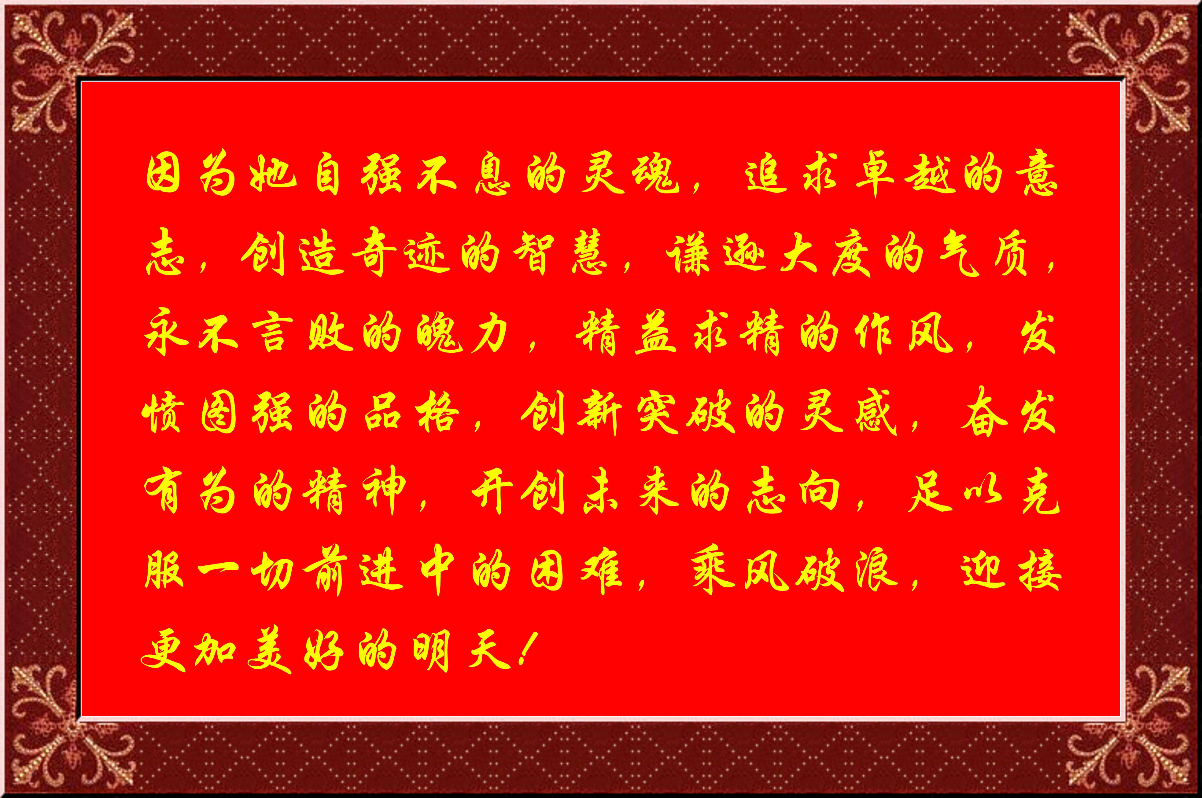 因為她自強不息的靈魂,追求卓越的意志,創(chuàng)造奇跡的智慧,謙遜大度的氣質(zhì),永不言敗的魄力,精益求精的作風(fēng),發(fā)憤圖強的品格,創(chuàng)新突破的靈感,奮發(fā)有為的精神,開創(chuàng)未來的志向,足以克服一切前進中的困難,乘風(fēng)破浪,迎接更加美好的明天!