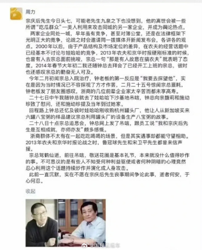 另?yè)?jù)國(guó)是直通車3日?qǐng)?bào)道,農(nóng)夫山泉副總周力博士朋友圈文,回應(yīng)“捧‘娃哈哈’踩‘農(nóng)夫山泉’風(fēng)波”。周力表示,宗慶后先生今日頭七,可能老先生九泉之下也沒想到,他的離世會(huì)被一些所謂“吃瓜群眾”一類人利用來(lái)攻擊同城的另一家企業(yè),并成為輿論熱點(diǎn)。兩家企業(yè)同處一城,早年雖有競(jìng)爭(zhēng),甚至對(duì)薄公堂,還是在法律框架下光明正大的競(jìng)爭(zhēng)。