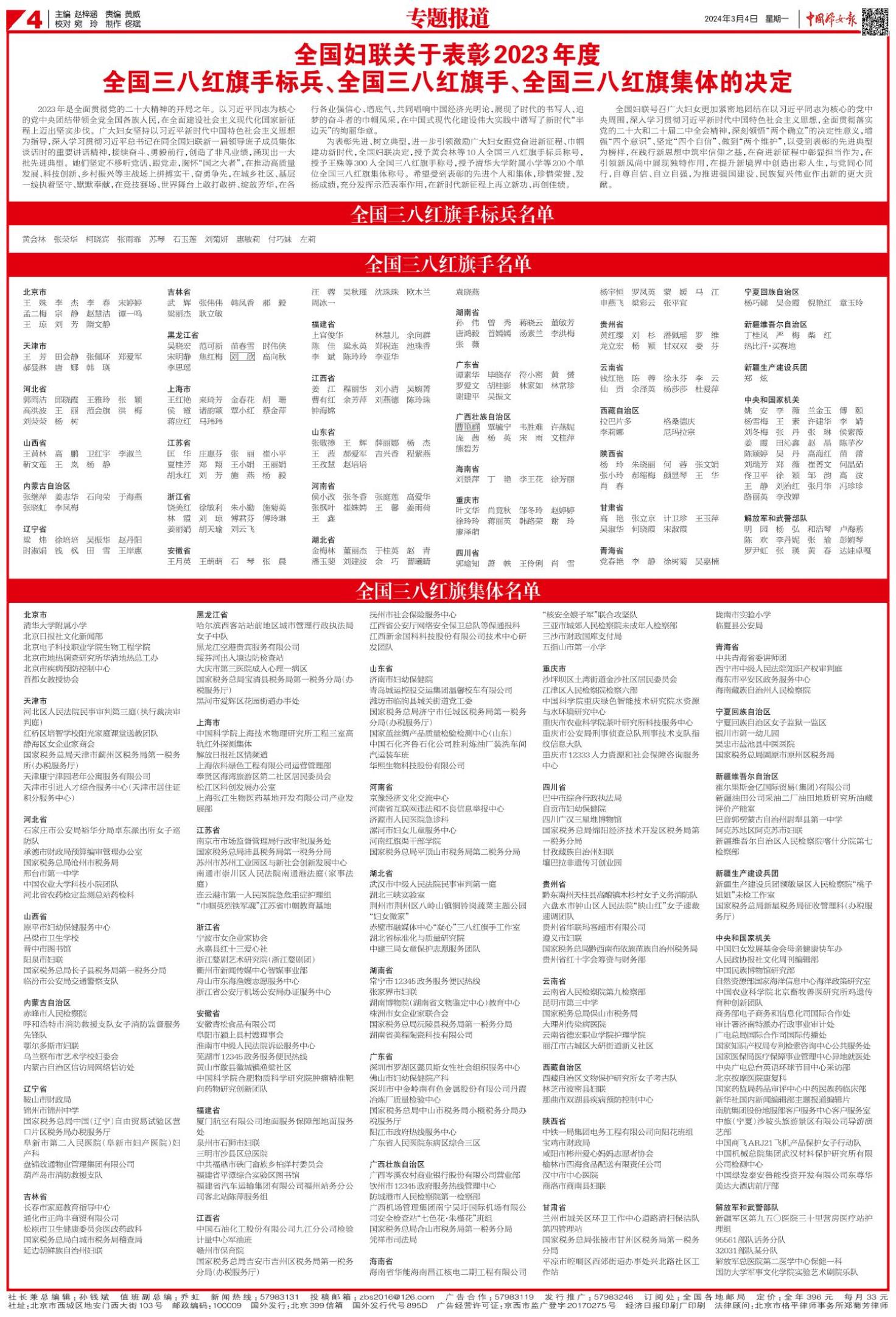 為表彰先進(jìn)、樹(shù)立典型,進(jìn)一步引領(lǐng)激勵(lì)廣大婦女跟黨奮進(jìn)新征程、巾幗建功新時(shí)代,全國(guó)婦聯(lián)決定,授予黃會(huì)林等10人全國(guó)三八紅旗手標(biāo)兵稱號(hào),授予王殊等300人全國(guó)三八紅旗手稱號(hào),授予清華大學(xué)附屬小學(xué)等200個(gè)單位全國(guó)三八紅旗集體稱號(hào)。希望受到表彰的先進(jìn)個(gè)人和集體,珍惜榮譽(yù)、發(fā)揚(yáng)成績(jī),充分發(fā)揮示范表率作用,在新時(shí)代新征程上再立新功、再創(chuàng)佳績(jī)。