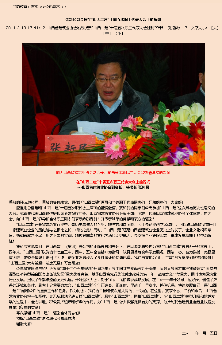 “山西二建”未來的發(fā)展,未來的前景強(qiáng)大!我可以告訴同志們:也是必然結(jié)果!我們今天參會(huì)的正式代表也罷,列席代表也罷,我在黨政聯(lián)席會(huì)議上,給領(lǐng)導(dǎo)同志們講的一點(diǎn),個(gè)別領(lǐng)導(dǎo)同志們也講,我說經(jīng)過未來三到五年的奮斗,我們要達(dá)成這樣一個(gè)目標(biāo),給二公司裝上一雙翅膀,讓二公司或者“山西二建”想往哪飛,就往哪飛!想飛多高,就飛多高!想飛多遠(yuǎn),就飛多遠(yuǎn)!這就是我們“十二五規(guī)劃”的目標(biāo)!這就是我們“十二五”訴求的東西!而且我前天已經(jīng)講了,那個(gè)時(shí)候的到來,同樣是我們“山西二建”的必然結(jié)果!所以前兩天同樣給同志們講,2011年的職代會(huì)絕對(duì)非比尋常!2011年的職代會(huì)絕對(duì)不比前幾年的職代會(huì)!她對(duì)二公司未來幾年甚至更多年的預(yù)示非常!意義非常!必將會(huì)對(duì)未來幾年或更多年的實(shí)際成果,發(fā)展成果印證!今天我們所訴求的!今天我們規(guī)劃的!今天我們?yōu)橹冻龅臓奚模?