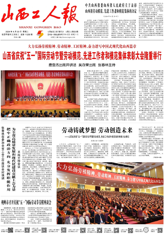 希望受表彰的勞動(dòng)模范、先進(jìn)工作者和模范集體珍惜榮譽(yù)、永葆本色,接續(xù)奮斗、勇攀高峰,示范帶動(dòng)更多的勞動(dòng)者在新時(shí)代新征程上再創(chuàng)佳績(jī)續(xù)寫(xiě)榮光。全省廣大勞動(dòng)群眾要更加緊密地團(tuán)結(jié)在以習(xí)近平同志為核心的黨中央周圍,堅(jiān)定擁護(hù) “兩個(gè)確立”,堅(jiān)決做到“兩個(gè)維護(hù)”,以勞動(dòng)模范為榜樣,用汗水澆灌夢(mèng)想,用拼搏篤定前行,用創(chuàng)新引領(lǐng)風(fēng)尚,為奮力譜寫(xiě)中國(guó)式現(xiàn)代化山西篇章貢獻(xiàn)智慧和力量,以優(yōu)異成績(jī)迎接中華人民共和國(guó)成立75周年!