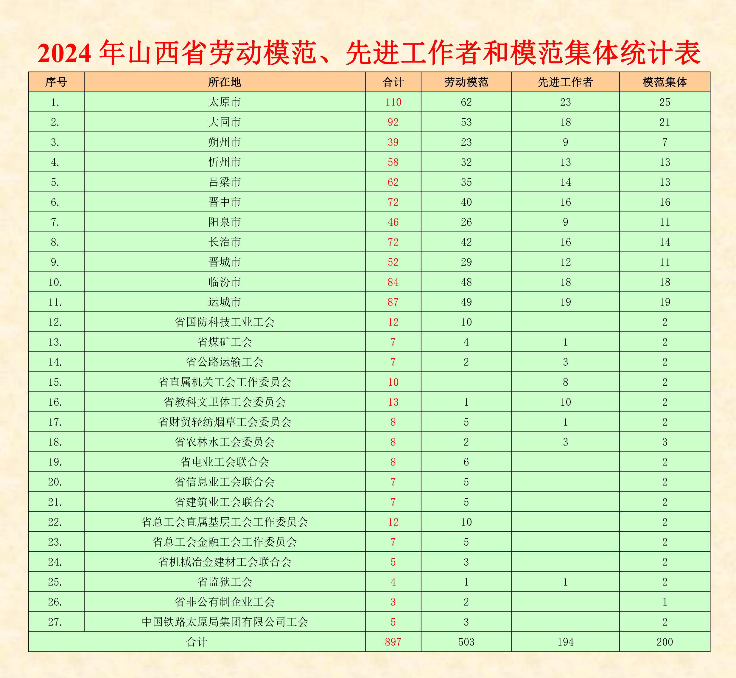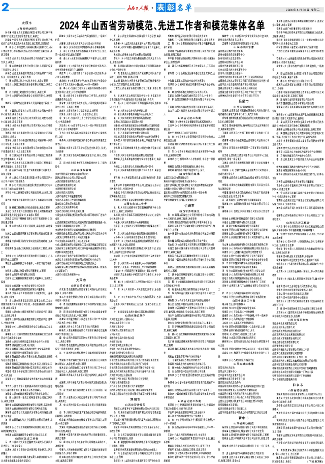 近年來(lái),全省上下堅(jiān)持以習(xí)近平新時(shí)代中國(guó)特色社會(huì)主義思想為指導(dǎo),全面貫徹落實(shí)黨的二十大和二十屆二中全會(huì)精神,深入學(xué)習(xí)貫徹習(xí)近平總書(shū)記對(duì)山西工作的重要講話重要指示精神,堅(jiān)決扛牢國(guó)家資源型經(jīng)濟(jì)轉(zhuǎn)型綜改試驗(yàn)區(qū)建設(shè)、深化能源革命綜合改革試點(diǎn)、推動(dòng)黃河流域生態(tài)保護(hù)和高質(zhì)量發(fā)展、打造內(nèi)陸地區(qū)對(duì)外開(kāi)放新高地等重大使命任務(wù),勠力攻堅(jiān)、真抓實(shí)干,推動(dòng)山西經(jīng)濟(jì)社會(huì)各項(xiàng)事業(yè)取得新進(jìn)展,各行各業(yè)、各條戰(zhàn)線涌現(xiàn)出一大批愛(ài)崗敬業(yè)、無(wú)私奉獻(xiàn),銳意創(chuàng)新、勇于擔(dān)當(dāng),貢獻(xiàn)突出、事跡感人的勞動(dòng)模范、先進(jìn)工作者和模范集體。為表彰先進(jìn)樹(shù)榜樣,凝心聚力再出發(fā),大力弘揚(yáng)勞模精神、勞動(dòng)精神和工匠精神,激勵(lì)全省人民以辛勤勞動(dòng)、誠(chéng)實(shí)勞動(dòng)、創(chuàng)造性勞動(dòng)投身高質(zhì)量發(fā)展和現(xiàn)代化建設(shè)的火熱實(shí)踐,省委、省政府決定授予莊迎等503名同志“山西省勞動(dòng)模范”榮譽(yù)稱號(hào);授予楚志兵等194名同志“山西省先進(jìn)工作者”榮譽(yù)稱號(hào);授予太原重工股份有限公司技術(shù)中心等200個(gè)集體“山西省模范集體”榮譽(yù)稱號(hào)。