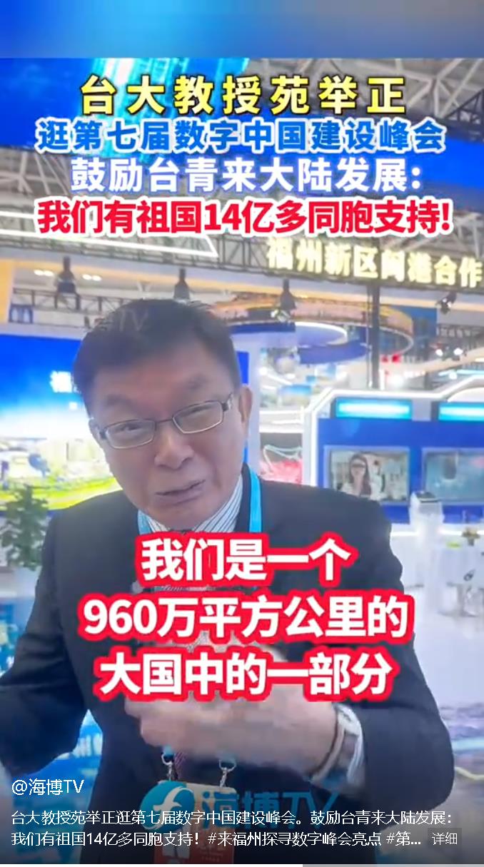 臺(tái)大教授苑舉正逛第七屆數(shù)字中國建設(shè)峰會(huì)。鼓勵(lì)臺(tái)青來大陸發(fā)展:我們有祖國14億多同胞支持!