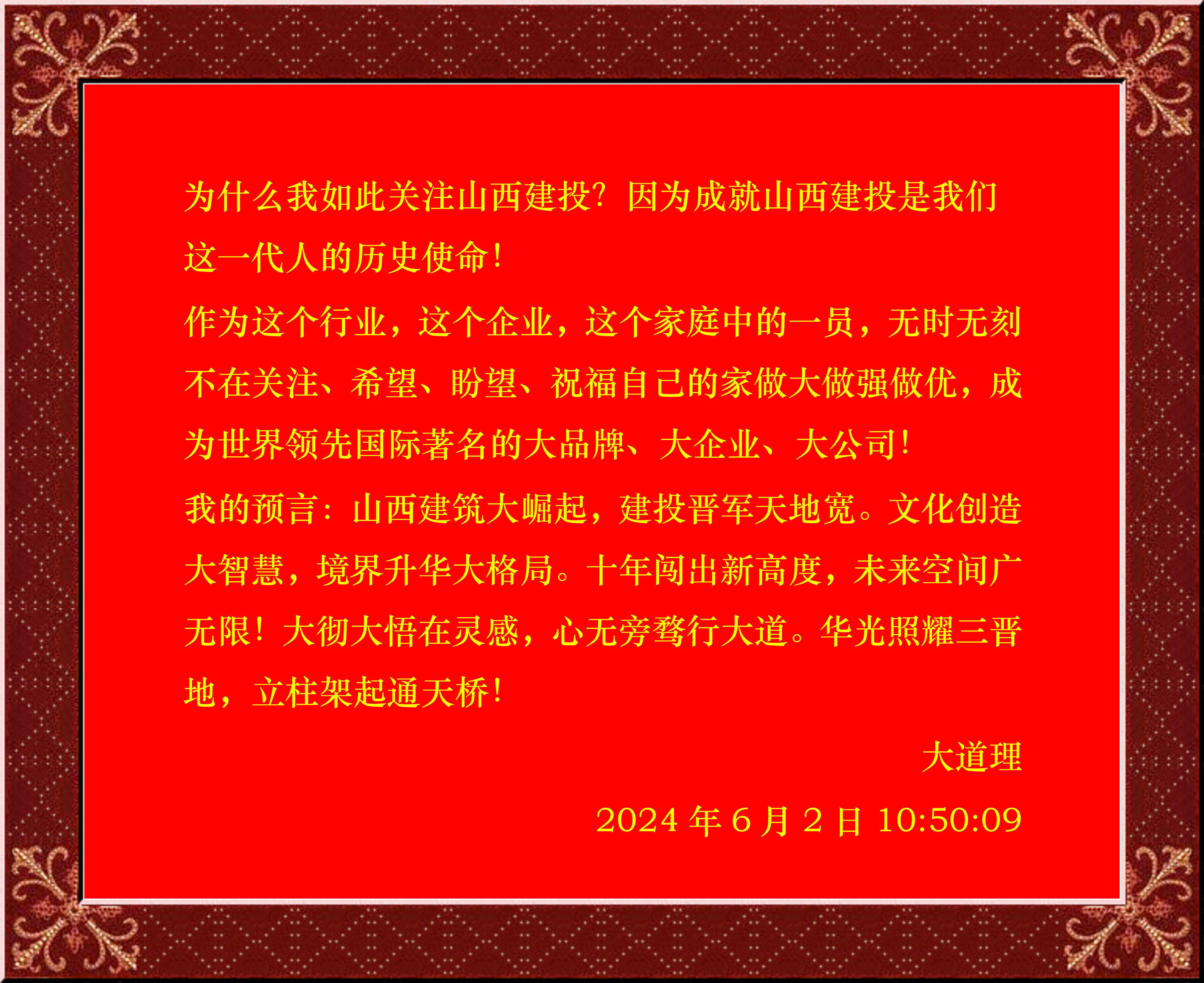 我的預言:山西建筑大崛起,建投晉軍天地寬。文化創(chuàng)造大智慧,境界升華大格局。十年闖出新高度,未來空間廣無限!大徹大悟在靈感,心無旁騖行大道。華光照耀三晉地,立柱架起通天橋!